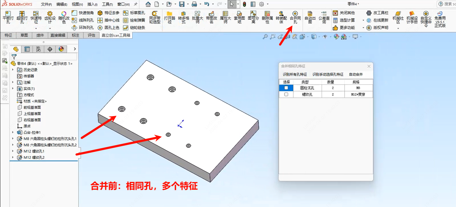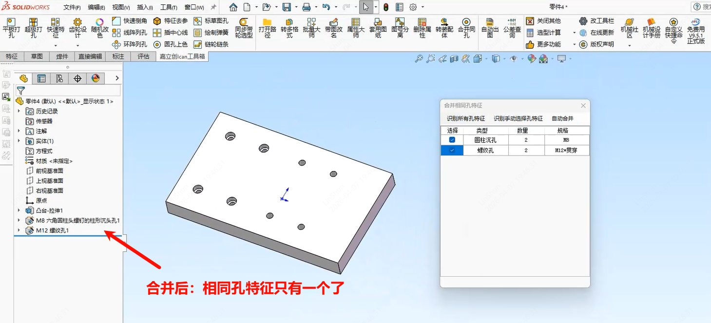 一键合并在同一个面上的相同孔特征,方便出图孔标注,简化设计树