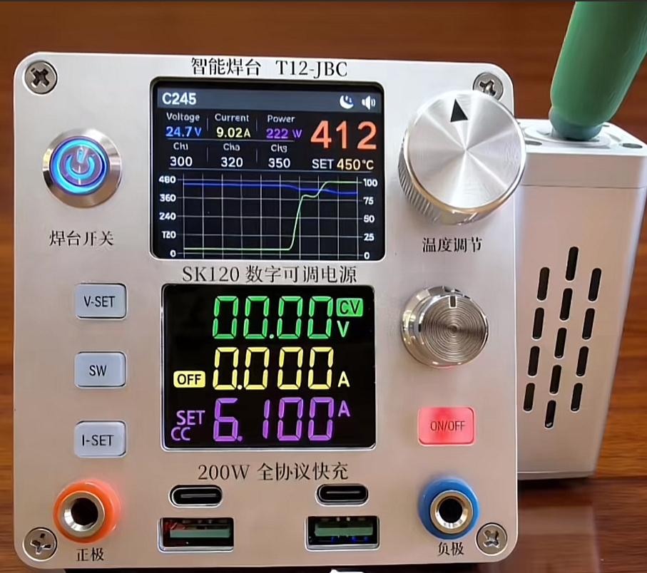 这款T245-JBC二合一智能焊台工作站,融合专业焊接与多功能供电于一体:不仅支持JBC/T245系列焊芯,具备精准温控与电压功率实时监测功能,还集成了一台数字可调稳压电源,支持电压电流精细调节。设备更配备了200W全协议快充接口,可为各类数码设备快速充电。全金属机身搭载高清大屏,交互直观清晰,既能胜任精细焊接,也可作为实验室电源与快充站使用,是电子工程师、维修技师与硬件爱好者的高效全能解决方案。