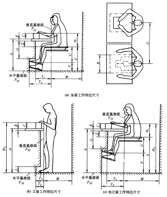 PXY—水平基准面;PYZ—垂直基准面;S—座位面高度;H1—坐姿工作岗位的相对高度;H2—立姿工作岗位的工作高度;A—工作平面高度;C—作业面高度;K—工作台面厚度;F—脚支撑高度;U—小腿空间高度;Z—大腿空间高度;G—坐姿工作岗位的腿空间高度;L—立姿工作岗位的脚空间高度;T1—腿部空间进深;T2—脚空间进深;B—腿部空间宽度(图a、b、c中B尺寸同);D—横向活动间距(图a、b、c中D尺寸同);W—向后活动间距 |