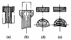 2.重要的轴类不能用圆棒车出(图a),必须锻制。而且锻制还应避免缩锻(图b,但比图a好),因为缩锻会使料中的轧丝破坏或容易破坏。在可能情况下,应尽量采用伸锻(图c)。重要的齿轮也应用锻制毛坯(图f)制造,而不要采用热轧钢棒(图d)或热轧钢板(图e)来加工 |