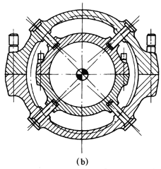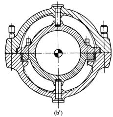 在壳体及法兰盘中,特别是在加热阶梯,温度的差异将引起椭圆变形。若零件不是完全回转对称,应使导轨元件设在对称线上,以防导轨卡死。图b导向元件安排得不符号膨胀规律,椭圆变形可能引起导轨的卡死。图b'符合膨胀规律的布置形式,导轨位于对称线上,不会产生椭圆变形下的卡死危险 |