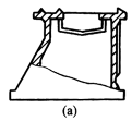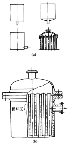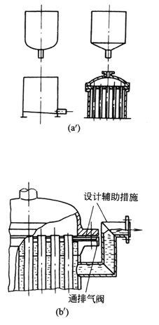(2)在立式冷却管中的水位线处由于高浓度而形成在气相与液相边界上的腐蚀,如图b。改进后的图b'通过加高水位而加以克服 |
