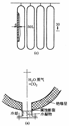 (3)图c、c'是两种高压气体贮藏器,图c'优于图c。因为,图c'受腐蚀面积仅为图c的1/6;预计10年后腐蚀深度为2mm,从强度看,图c对此腐蚀量决不可忽视,迫使增大壁厚达8mm,而对图形c′来说,2mm腐蚀量对于30mm的壁厚,几乎没有大的影响 (4)图a容器出口支承没有绝缘,由于冷却到露点以下,形成具有强烈电解质性质的冷凝物。在冷凝物与气体的过渡处产生可能导致支承损坏的腐蚀。改进后的图b、图c一边采用绝缘,另一边则采用抗腐蚀性好的材料制成特殊支承,防止了损坏 |
