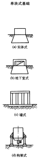 单块式基础是根据工艺上的要求单独建成的。它与其他基础或厂房基础无关。其顶面形状和机械设备底座相似,或稍大一些,标高以工艺要求来确定。单块式基础以其结构形状的不同,又分为下列几种: |