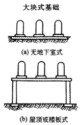 这种基础建成连续的大块形状,以供邻近的多台机械设备、辅助设备和工艺管道安装使用,见图a。有时也可将厂房的混凝土楼板或屋顶作为大块式基础进行安装,见图b |