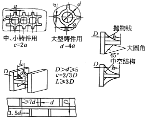 带有筋的截面的铸件尺寸比例 |