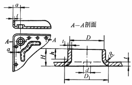 K—翻边时材料(退火的)变薄的最大允许范围系数:白铁皮为0.7;黄铜H62(t=0.5~5)为0.68;酸洗钢板为0.72;软铝为0.76;硬铝为0.89 |