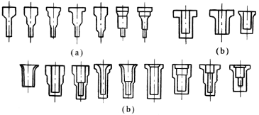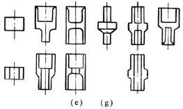 1.正挤压:坯料从模孔中流出部分的运动方向与凸模运动方向相同的挤压 2.反挤压:二者运动方向相反的挤压。又分杯形件反挤压(c图)与杯-杆件反挤压(d图) 3.复合挤压:同时兼有正、反挤时金属流动特征的挤压,又分杯-杯件(e图)、杯-杆件(f图)、杆-杆件复合挤压(g图) 4.镦挤:镦粗、挤压复合组成(h图) |