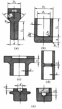 复合挤压件连皮位置及厚度t1:一般情况下杯-杯型挤压件连皮位置应放在中间(图d);扁平类挤压件连皮位置应设在大端(图c);连皮厚度t1大于或等于壁厚t |