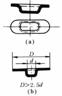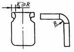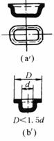 各部分尺寸的比例关系要恰当。 图a结构不仅拉深困难,且须增加工序,放宽切边余量,金属浪费大 图b结构要用四五道拉深工序,并须中间退火,制造困难,图b'仅用一二道工序即可完成,且不须中间退火 |
