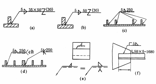 注:1.标注对称焊缝和交错对称焊缝的尺寸时,允许在基准线上只标注一次,如图 a 所示。 2.当断续焊缝、对称断续焊缝和交错断续焊缝的段数无严格要求时,允许省略焊缝段数,如图 b 所示。 3.在不致引起误解的情况下,当箭头线指向焊缝,而非箭头侧又无缝焊要求时,允许省略非箭头侧的基准线(虚线),如图f所示。 4.在同一图样上全部焊缝所采用的焊接方法完全相同时,焊缝符号尾部表示焊接方法的代号可省略不注,但必须在技术要求或其他技术文件中注明“全部焊缝均采用……焊”等字样;当大部分焊接方法相同时,也可在技术要求或其他技术文件中注明“除图样中注明的焊接方法外,其余焊缝均采用……焊”等字样。 5.在同一图样中,当若干条焊缝的坡口尺寸和焊缝符号均相同时,可采用图c 的方法集中标注;当这些焊缝同时在接头中的位置均相同时,也可采用在焊缝符号的尾部加注相同焊缝数量的方法简化标注,但其他型式的焊缝,仍需分别标注,如图d 所示。 6.当同一图样中全部焊缝相同且已用图示法明确表示其位置时,可统一在技术要求中用符号表示或用文字说明,如“全部焊缝为5 7.为了简化标注方法,或者标注位置受到限制时,可以标注焊缝简化代号图 e,但必须在该图样下方或在标题栏附近说明这些简化代号的意义。 8.当焊缝长度的起始和终止位置明确(已由构件的尺寸等确定)时,允许在焊缝符号中省略焊缝长度,如图f 所示。