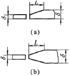 不同厚度钢板对接焊接时,如果两板厚度差(δ-δ1)不超过本表规定,则焊接接头的基本型式与尺寸按较厚板的尺寸数据来选取。否则,应在较厚的板上作出单面(如表中图a)或双面(如图b)削薄,其削薄长度l≥3(δ-δ1)。 |