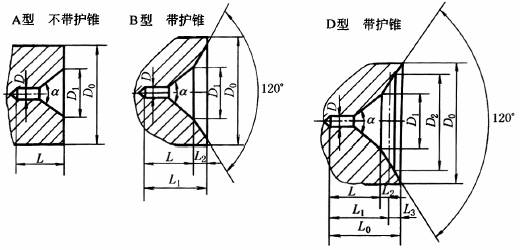 注:1.中心孔的选择:中心孔的尺寸主要根据轴端直径D0 和零件毛坯总重量(如轴上装有齿轮、齿圈及其他零件等)来选择。若毛坯总重量超过表中D0相对应的重量时,则依据毛坯重量确定中心孔尺寸。 2.当加工零件毛坯总重量超过5000kg时,一般宜选择B 型中心孔。 3.D 型中心孔是属于中间型式,在制造时要考虑到在机床上加工去掉余量“L3”以后,应与B 型中心孔相同。 4.中心孔的表面粗糙度按用途自行规定。 |