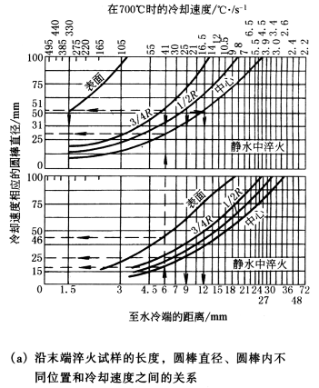 已知:选用40Cr,回火前不同断面硬度值>46HRC 首先直接从图40Cr钢淬透曲线上的纵坐标46HRC处向右引水平线交淬透性带的下线,再由交点向上作垂线就可查得圆形零件尺寸,或由交点向下作垂线,找到d=6,再由图a查得水淬时,f 51mm的3/4R处,f 31mm的中心;油淬时,f 46mm的表面,f 25mm的3/4R处,f 51mm的中心处均能淬到同样硬度,因此,凡设计小于上述尺寸的圆形零件,其淬火硬度均不低于46HRC |