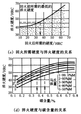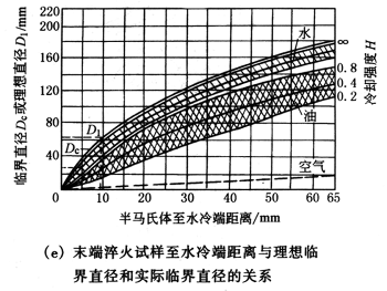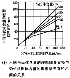 已知:材料的淬透性曲线 1.根据选用材料的含碳量从图d找出相当于半马氏体(50%M)区的硬度,并由已知淬透性曲线上找出相同硬度下至水冷端的距离 2.从第一步找出的距离在图e的横坐标上找到相同数值处,引出垂线与各冷却强度曲线相交,再由交点向左引纵坐标的垂线,便可得出相应冷却剂的临界淬透直径 3.如果理想临界直径的马氏体量不是以50%为标准,则可按图f进行换算 |