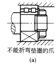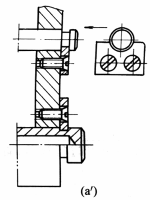 图a因安装位置的周围无足够的空间弯曲止动垫圈的爪,不能止动。改进后(图a')采用骑缝螺钉,保证止动可靠 |