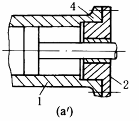液压缸要求缸盖上的孔与缸体内圆表面同轴。若按图a所示缸盖2与缸体1用螺纹3直接联接,由于螺纹之间有间隙,不能保证缸盖2与缸体1孔的同轴度,活塞杆易偏移。改进后(图a')另设置装配基面4 |
