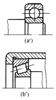(2)图a轴承内圈或图b轴承外圈不易拆卸,应使轴肩高度小于内圈厚度(图a'),或孔的凸肩高度小于外圈厚度(图b') |