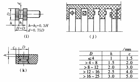 合理设计塑料零件的嵌件: 图a,尽量采用不通孔或不穿的螺纹孔,这样可在设计模具时采用插入式解决嵌件的定位 图b,嵌件表面需滚花或开设沟槽时,一般小嵌件的沟槽,深为1~2mm,宽为2~3mm,转角处为圆弧,滚花为菱形;齿高1~2mm如零件受力很小时,可只采用菱形滚花,不开沟槽 图c,条件许可时,金属嵌件应凸起或凹入1.5~2mm,以保证嵌件稳定 图d,布置在凸耳或凸起部分的嵌件,应比凸耳或凸起部分长一些,以提高零件的机械强度 图e,尽量避免采用片状、细长的嵌件。当必须采用膜片、细长的嵌件时,为防止成型时塑料对嵌件冲击而造成弯曲变形,应采用销钉支承或打孔A通流 图f,螺杆嵌件的光杆部分与模具应为H8/f9配合。为防止塑料沿螺纹部分溢料,螺纹部分应留在塑料外面,如右图设计 图g,螺纹通孔嵌件高度应低于成型高度0.05mm。嵌件过高易产生变形 图h,嵌件装夹定位部分应具有H8/f9配合,以保证金属嵌件能精确地固定在模具中 图i,圆柱表或套筒形嵌件推荐结构尺寸如右图,在特殊情况下H可加大,但不得大于2D 图j,板形、片状金属嵌件可采用右图方式固定。当嵌件厚度小于0.5mm时,最好不用孔固定结构,而采用切口或折弯的方法固定 图k,金属嵌件周围的塑料不能太薄,否则塑料会因冷却收缩而破裂。右图中列出了嵌件周围塑料层的推荐尺寸 |