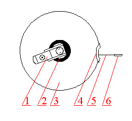 盒式卷尺 1—摇柄 2—护圈 3—尺盒 4—盒门 5—尺带 6—拉环 |