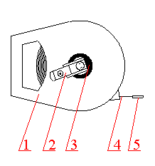 架式卷尺 1—尺架 2—摇柄 3—护圈 4—尺环 5—拉环 |