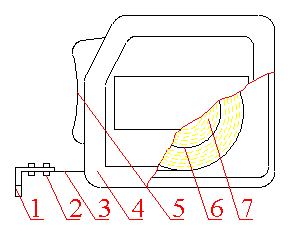 B型(自卷制动式) 1—尺钩 2—铆钉 3—尺带 4—尺盒 5—制动按钮 6—转盘 7—尺簧 |