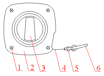 C型(摇卷盒式) 1—螺钉 2—尺盒 3—摇柄 4—尺带 5—铆钉 6—拉环 |
