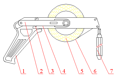 D型(摇卷架式) 1—手柄 2—摇柄 3—铆钉 4—尺架 5—尺带 6—转盘 7—重锤体 |