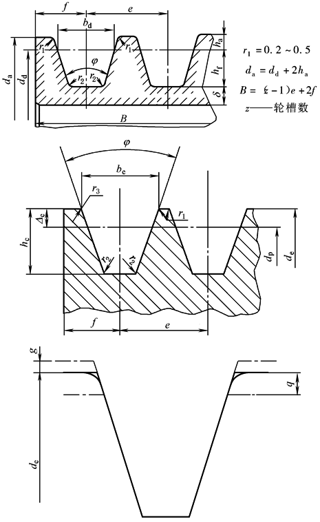 注:1.表中δ、r1、r2及r3尺寸标准中未作规定,仅供设计参考。 2.Δe能够趋近于零。 3.轮槽截面直边尺寸应不小于de-2q。 |