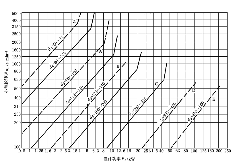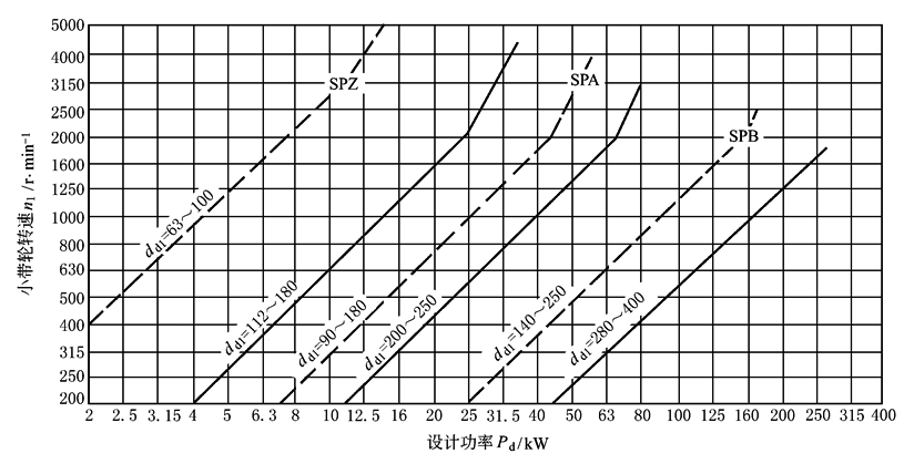 根据Pd和n1,普通V带由图1选取 基准宽度制窄V带由图2选取 有效宽度制窄V带由图3选取 |
