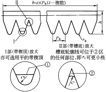 型号 | 楔距 Pb | 带高 h≈ | 楔顶圆弧半径 rbmin | 槽底圆弧半径 rtmax | 楔数 z |