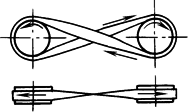 两轴交错,只能单向传动 带受附加扭转 带轮要有足够的宽度B=1.4b+10(B—轮宽,mm) |