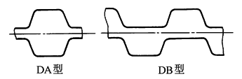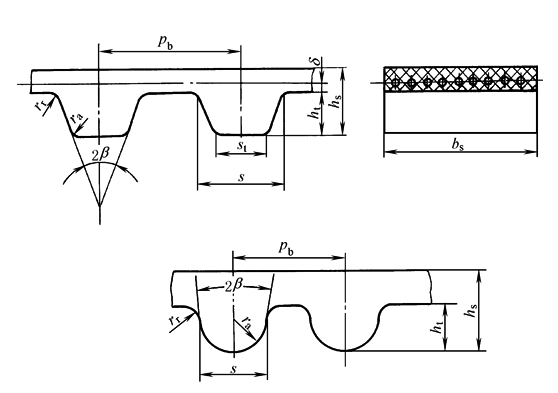 注:1.周节制同步带有单面齿、双面齿之分,双面齿同步带又分为对称齿(代号为DA型)、交错齿(代号为DB型)、见下图。 2.本表的hs为单面齿的带高。