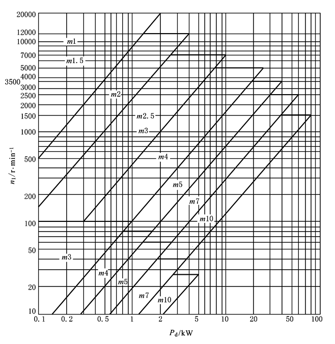 根据Pd和n1周节制、特殊节距制(图1中括号部分)由图1选取;模数制由图2选取;圆弧齿由图3选取 |