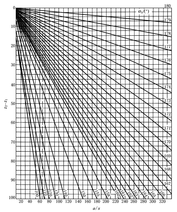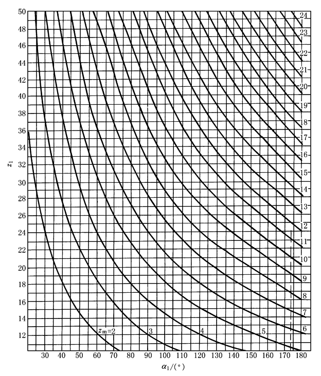 对MXL、XXL和XL型或对于m=1,1.5,一般zm≥zmmin=6,对于T2.5、T5对于圆弧齿3M,5M,必要时zmmin=4 对于特殊节距制首先在图4中纵横坐标的交点求出α1;然后在图5中由纵横坐标的交点求出,并圆整到最接近的那条zm曲线 若zm<zmmin时,可增大a或d1不变时,采用较小的pb(或m) |