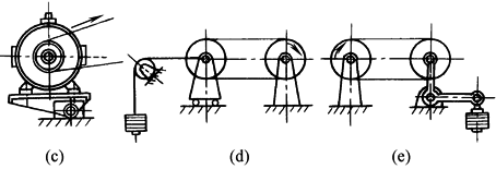 c是靠电机的自重或定子的反力矩张紧,多用于小功率传动。应使电机和带轮的转向有利于减轻配重或减小偏心距 d、e常用于带传动的试验装置 |