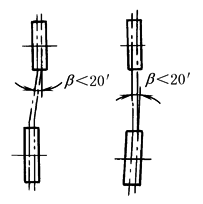 1) 安装前应检查带是否配组,不配组的带、新带和旧带、普通V带和窄V带不能同组混装使用 2) 联组带在安装前必须检查各轮槽尺寸和槽距,对超过规定偏差的带轮应更换 3) 安装带时不得强行撬入,普通V带、基准宽度制窄V带应按表计算内容和步骤、有效宽度制窄V带应按表有效宽度制窄V带传动中心距调整范围、多楔带应按表中心距调整量、胶帆布平带(环形)应按表计算内容和步骤、同步带应按表中心距调整范围的有关规定范围将中心距离缩小,待带进入轮槽后,再进行张紧 4) 中心距的调整应使带的张紧适度,所需初张紧力可按下述方法控制 5) 传动装置中,各带轮轴线应相互平行,各带轮相对应的槽型对称平面应重合;V带误差不得超过20',见右图,同步带其带轮的共面偏差见下表 6) 带传动装置应加防护罩,并应保证通风 |