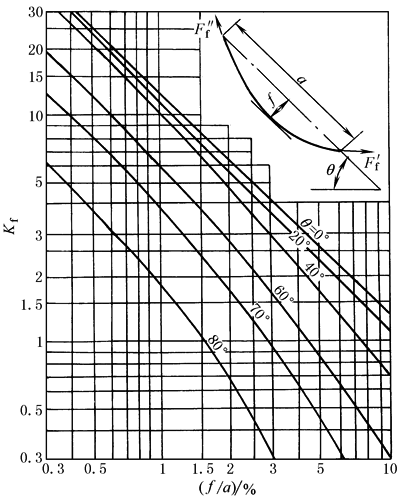 Kf—— 系数,见左图; a—— 链传动中心距,mm; θ—— 两轮中心连线对水平面倾角; np—— 许用安全系数,np=4~8 若以最大尖峰载荷代替f1Ft时,则np=3~6;若速度较低,从动系统惯性小,不太重要的传动或作用力的确定比较准确时,np可取较小值 | ||||||||||||