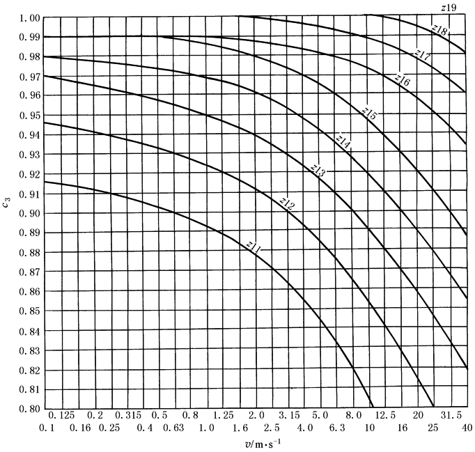 d2—— 滚子链销轴直径,mm,见表滚子链的基本参数与尺寸; c1—— 磨损系数,见图1; c2—— 节距系数,见下表; c3—— 齿数-速度系数,见图2; pr—— 铰链的压强,MPa | ||||||||||