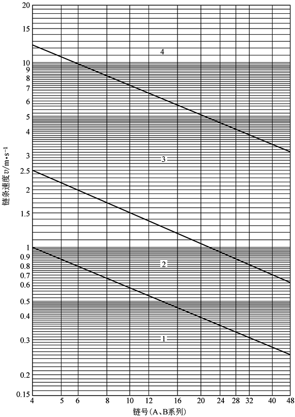 图3 润滑范围选择图 范围1—用油壶或油刷定期人工润滑;范围2—滴油润滑;范围3—油池润滑或油盘飞溅润滑;范围4—油泵压力供油润滑,带过滤器;必要时带油冷却器(当链传动的空间狭小,并作高速、大功率传动时) 注:齿形链传动有三种基本润滑方式。方式Ⅰ为图中范围1~2;方式Ⅱ为范围3;方式Ⅲ为范围4 | ||||||||||