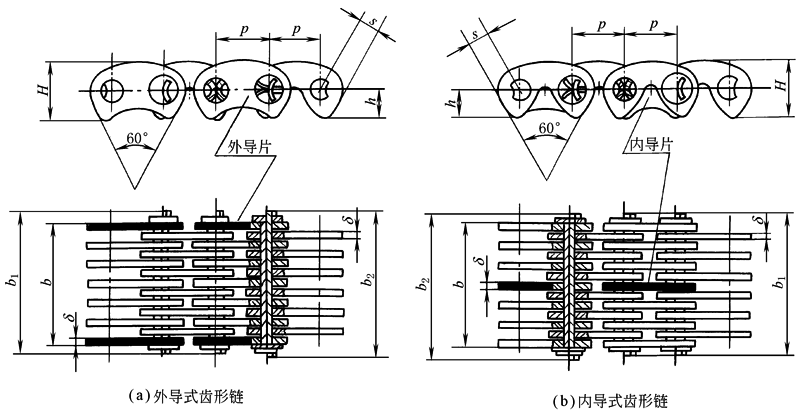 ① 由于“齿形链和链轮(GB/T 10855—2003)”标准中没有标出链宽b等具体参数,选用不方便,本节仍摘录当前国内制造厂沿用的旧标准(GB/T 10855—1989)的产品样本资料。 注:1.尺寸s的偏差为h10。 2.标记示例: |