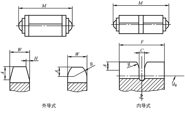 注:1.链号由字母SC与表示链条节距和链条公称宽度的数字组成。节距p=4.76mm的链条链号中0后面的第一位数字乘以1.5875mm(1/16in)为链条节距,最后一位或二位数乘以0.79375mm(1/32in)为齿形链的公称宽度。 2.节距p=4.76mm齿形链条的链板厚度均为0.76mm,故链号中的宽度数值也就是链条宽度方向的链板数量。 3.M为链条最大宽度。 4.切槽刀的端头可以是圆弧形或矩形,dg见表节距p=4.76mm链轮的数表。 |