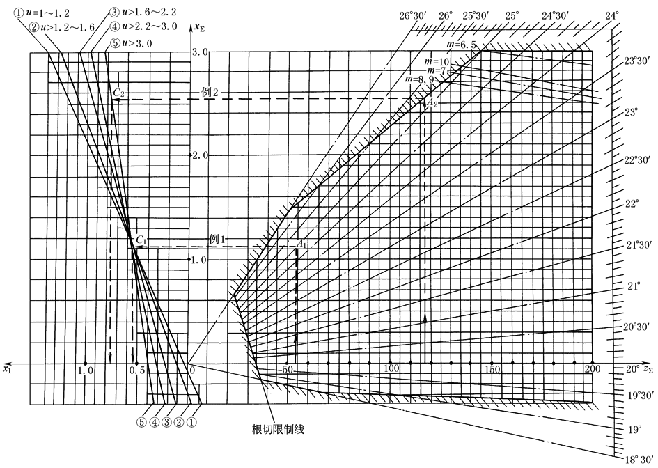 选择变位系数线图(ha*=1,α=20°) 在确定总变位系数xΣ之后,再按照该线图左侧的五条斜线分配变位系数x1和x2。该部分线图的纵坐标仍表示总变位系数xΣ,而其横坐标则表示小齿轮z1的变位系数x1(从坐标原点0向左x1为正值,反之x1为负值)。根据xΣ及齿数比u=(z2/z1),即可确定x1,从而得x2=xΣ-x1 按此线图选取并分配变位系数,可以保证: 1) 齿轮加工时不根切(在根切限制线上选取xΣ,也能保证齿廓工作段不根切); 2) 齿顶厚sa>0.4m(个别情况下sa<0.4m但大于0.25m); 3) 重合度ε≥1.2(在线图上方边界线上选取xΣ,也只有少数情况ε=1.1~1.2); 4) 齿轮啮合不干涉; 5) 两齿轮最大滑动率接近或相等(η1≈η2); 6) 在模数限制线(图中m=6.5,m=7,…,m=10等线)下方选取变位系数时,用标准滚刀加工该模数的齿轮不会产生不完全切削现象。该模数限制线是按齿轮刀具“机标(草案)”规定的滚刀长度计算的,若使用旧厂标的滚刀时,可按下式核算滚刀螺纹部分长度l是否够用