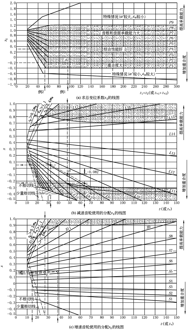 利用图1可以按对承载能力和传动平稳性的不同要求选取变位系数。图1适用于z>10的外啮合齿轮。当所选的变位系数落在b图或c图的阴影区内时,要校验过渡曲线干涉;除此之外,干涉条件已满足,不需要验算。b图中的L1~L17线和c图中的S1~S13线是按两齿轮的齿根强度相等、主动轮齿顶的滑动速度稍大于从动轮齿顶的滑动速度、滑动率不太大的条件,综合考虑做出的 图1的使用方法如下 1) 按照变位的目的,根据齿数和(z1+z2),在a图中选出适宜的总变位系数xΣ 2) 利用b图(减速齿轮)或c图(增速齿轮)分配xΣ;按 L线或S线相应的射线;过z1和z2做垂线,与所引射线交点的纵坐标即为x1和x2 3) 当大齿轮的齿数z2>150时,可按z2=150查线图 4) 斜齿轮按zv=z/cos3β查线图,求出的是xn