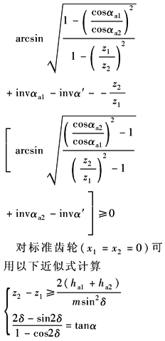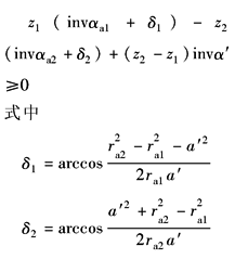 用插齿刀加工内齿轮时,在这种干涉下,内齿轮的齿顶渐开线部分将遭到顶切,不产生重叠干涉时的(z2-z1)min值见表不产生重叠干涉的条件 αa1、αa2——齿轮1、2的齿顶压力角 α'——啮合角 |