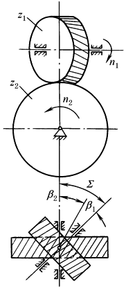 注:交错轴斜齿轮实际上是两个螺旋角不相等(或螺旋角相等,但旋向相同)的斜齿轮,因此其他尺寸的计算与斜齿轮相同,可按表标准齿轮传动的几何计算进行。 |