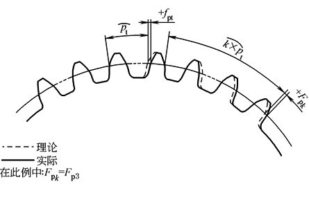 齿距偏差 2)齿距累积偏差(Fpk) 任意k个齿距的实际弧长与理论弧长之代数差(见上图)。理论上它等于这k个齿距的各单个齿距偏差的代数和 注:除非另有规定,Fpk的计值仅限于不超过圆周八分之一的弧段内,因此,偏差Fpk的允许值适用于齿距数(k)为2至z/8的弧段内,通常Fpk取k≈z/8就足够了。如果对于特殊应用(例如高速齿轮),还需检验较小弧段,应规定相应的k值 3)齿距累积总偏差(Fp) 齿轮同侧齿面任意弧段(k=1至k=z)的最大齿距累积偏差。它由齿距累积偏差曲线的总幅度值表示 |