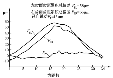 等效采用ISO 1328—1975的GB/T 10095—1988国家标准中齿轮定义的有14项,其中基节偏差Δfpb、齿圈径向跳动ΔFr、径向综合误差ΔFi"、一齿径向综合误差Δfi"、公法线长度变动ΔFw,接触线误差ΔFb、轴向齿距偏差ΔFpx、螺旋线波度误差Δffβ,在ISO 1328-1:1995(E)国际标准中被废止而消失,另外增加了计值范围、平均迹线、形状和斜率偏差 1)基节偏差Δfpb 通常是用便携式比较仪来测量,借助于一个合适的量规标定,直接用来测量与理论基圆齿距比较的偏差,在测量时必须保证比较仪的触头接触点不在齿廓或螺旋线的修形区或减薄区。当手头没有合适的量仪时,测得的基圆齿距偏差可以做推断压力角偏差fα的基础,因为受齿距偏差和齿廓形状偏差的影响,只能在fpt、ffα的偏差很小时才能使用 2)齿圈径向跳动ΔFr 它是在齿轮一转范围内,测头在齿槽内于齿高中部双面接触,测头相对于齿轮轴线的最大变动量。径向跳动是受右侧和左侧两个齿面同时接触的影响,两侧齿面的偏差对于径向跳动值可能有相互抵消的影响,见图1。实际齿轮只有很小的径向跳动,而有明显的齿距累积总偏差,很明显,同侧齿面偏差例如齿距或齿廓偏差是不可能用测量径向跳动值来获得的,同理,径向综合误差ΔFi" 和一齿径向综合误差Δfi" 也是包含了右侧和左侧齿面综合的成分,想确定同侧齿面的单项偏差是不可能的