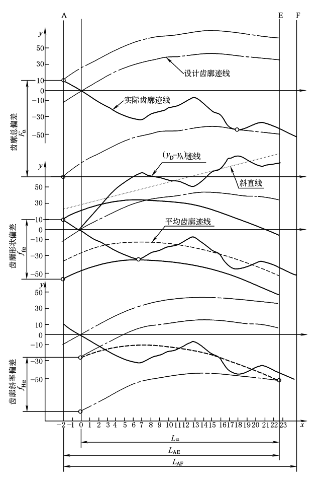 式中 ha*——齿顶高系数,通常ha*=1 例:mn=3,Z1=79,β=8°06' 24",α=20°,x1=0,ha*=1,计算LAE和Lα 若已知配对齿轮齿数Z2=22,则LAE=15.06mm,Lα=LAE×92%=15.06×92%=13.86mm; 若配对齿轮为未知,则LAE=16.85mm,其与Lα=13.86mm相比,要相差20%长度; 所以确定Lα=13.86≈14mm是合理而有益的,可以减少冤枉的不合格品 ② 取值范围的横坐标 a.齿廓偏差 由实测的实际齿廓迹线见图2齿廓偏差(ⅲ)图形,A点是轮齿齿顶或倒角的起点;E点是有效齿廓起始点;F点是可用齿廓起始点;Lα是齿廓计值范围;LAE是有效长度;LAF是可用长度。 中,Lα等分区间为Nα=23,Lα是i为0~23,偏差采值点nα=Nα+1=24,LAE=减薄区+Lα,LAE是i为-2~0~23,其等分区为NAE=25,偏差采值点nAE=NAE+1=26