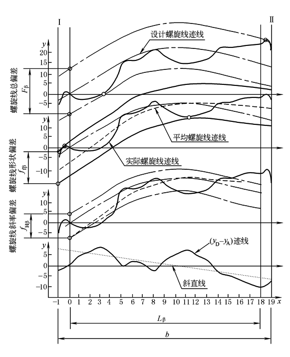 图2 齿廓偏差(ⅲ)图形 b.螺旋线偏差 由实测的实际螺旋线迹线见图3螺旋线偏差(ⅲ)图形,Ⅰ是基准面,Ⅱ是非基准面,b为齿宽或两端倒 角之间的距离,Lβ是螺旋线计值范围,Lβ=(b的迹线长度-b×10%)或Lβ=(b的迹线长度-m)。 端减薄区各为 端减薄区i为-1~0和18~19,齿宽b的等分区间为Nb=20,偏差采值点nb=Nb+1=21 ③平均迹线的确定 图2和图3的一个实测的实际齿廓(螺旋线)迹线yAi是[ 根据平均迹线的定义 因为